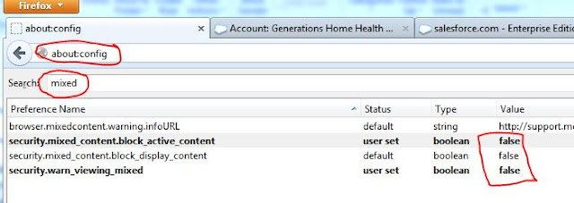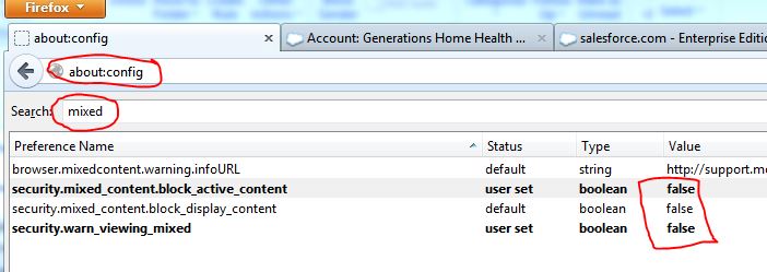 At the company I work for we have an HTTP iframe inside an HTTPS web page. The new version of Firefox objects to this mixed content and forces the user to respond by clicking on a little shield icon in order to allow the mixed content. However Firefox does not "remember" this override, nor does it allow a "white list" of domains where you don't care about mixed content. You can however disable the checking entirely by changing these options shown in the graphic above. PLEASE do not do this unless you completely understand the security implications.