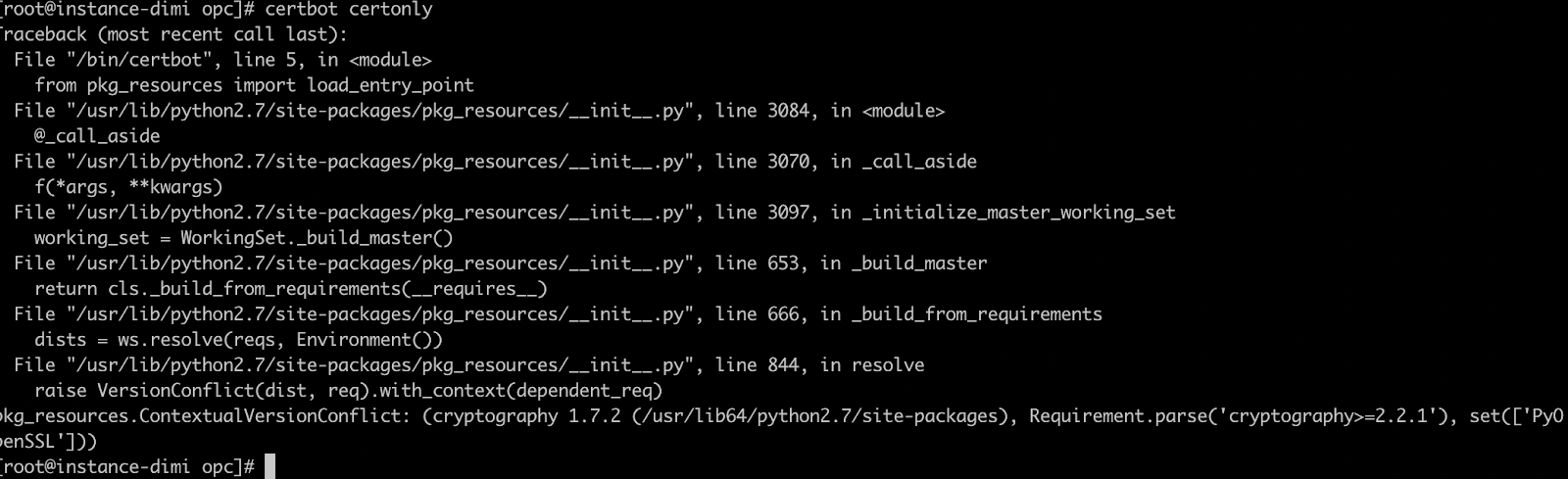 Ha! Apparently not so simple after all?! We got an error. This might happen when packages are incompatible. Normally yum should take care of that, but as we installed Certbot with Pip, let's upgrade all those components too.