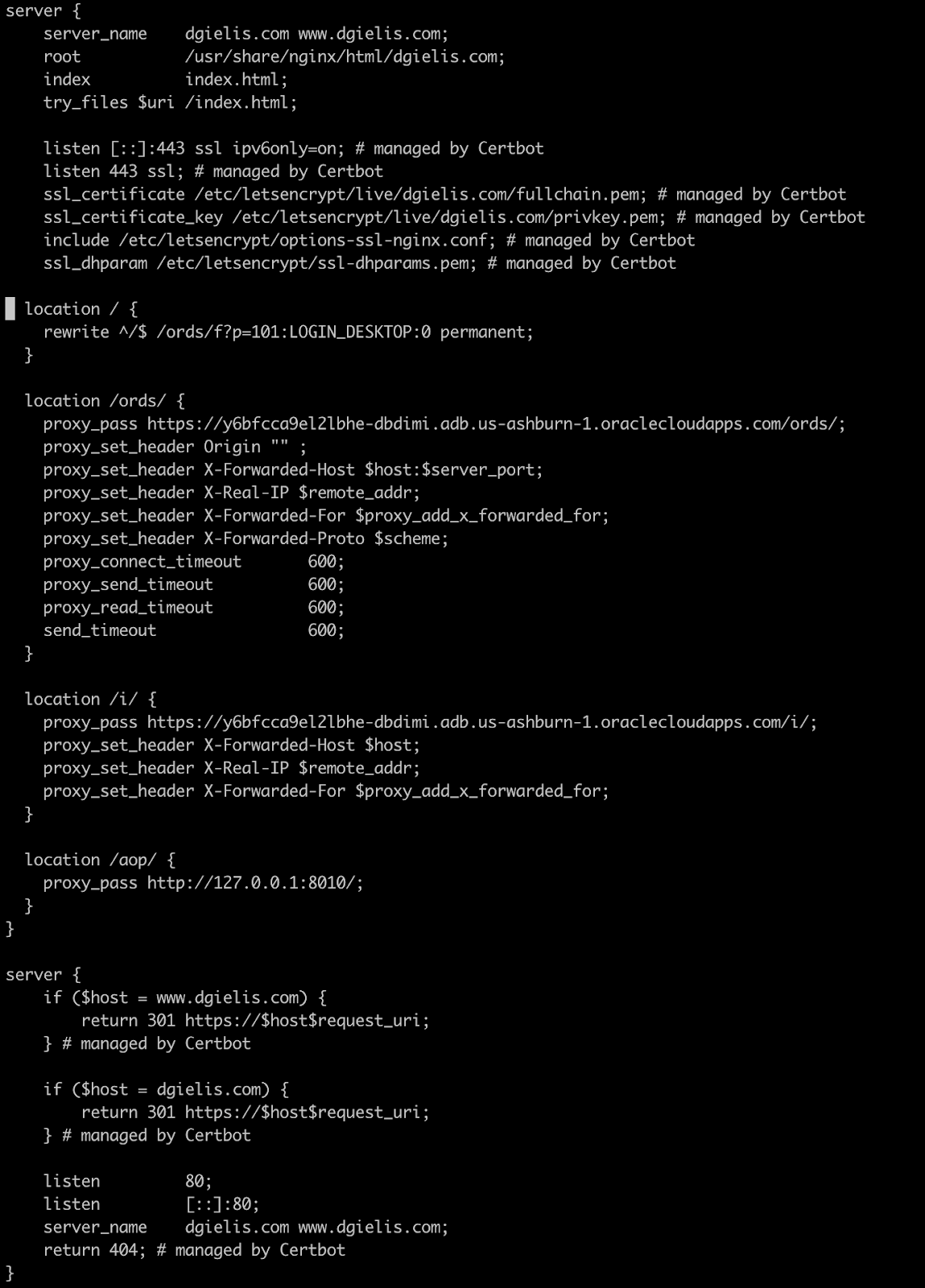 In that blog post we setup Nginx as our web server, and as a proxy in front of Oracle APEX running on the Autonomous Database Cloud, so we can serve our own domain name e.g. dgielis.com.