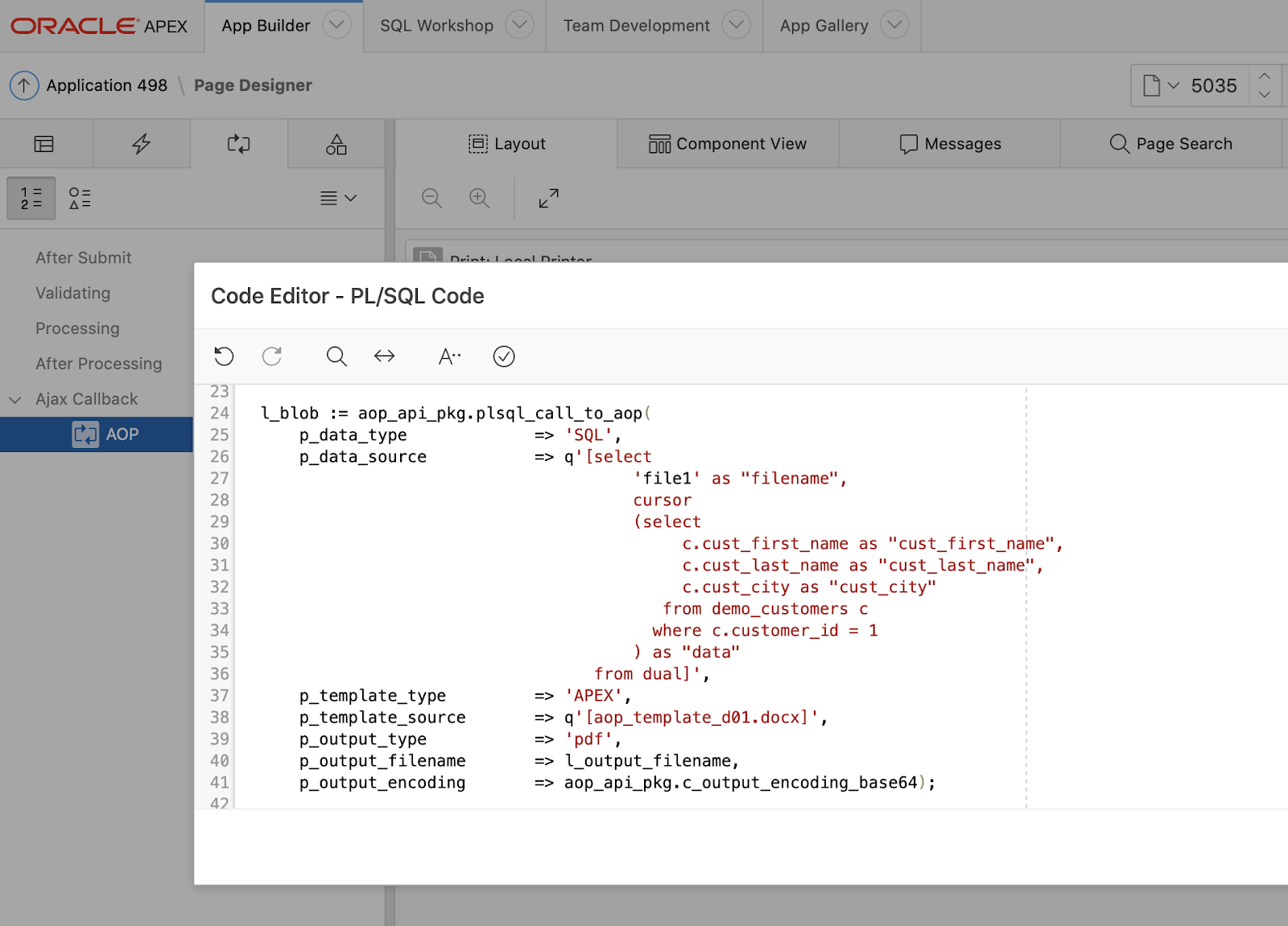 With AOP we ship an AOP Sample App. This is an APEX application which showcases many features of APEX Office Print: