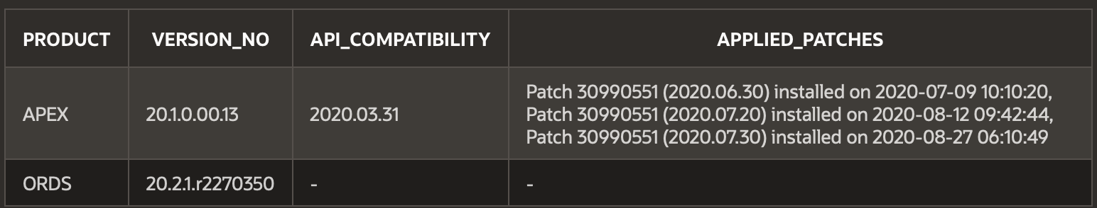 select 'ORDS' as product, ords.installed_version as version_no, null as api_compatibility, null as applied_patches from dual;