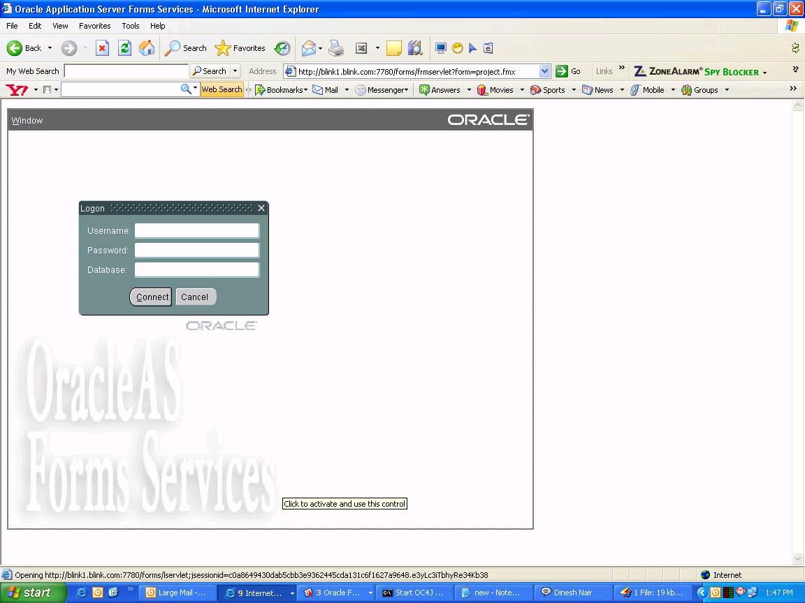 I have installed 10AS with forms services also. I put my project.fmx in forms folder in oracle_home. I am using http://<servername>:7780/forms/frmservlet?form=project.fmx to invoke my form through web using IE. it invokes but asks for username/password. I am providing "SYSTEM" usename and its password then it is navigating to my form. what could be the issue.