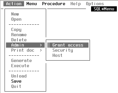 When SQL*Menu runs, select Action menu, Admin > and Grant access.