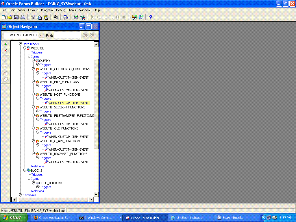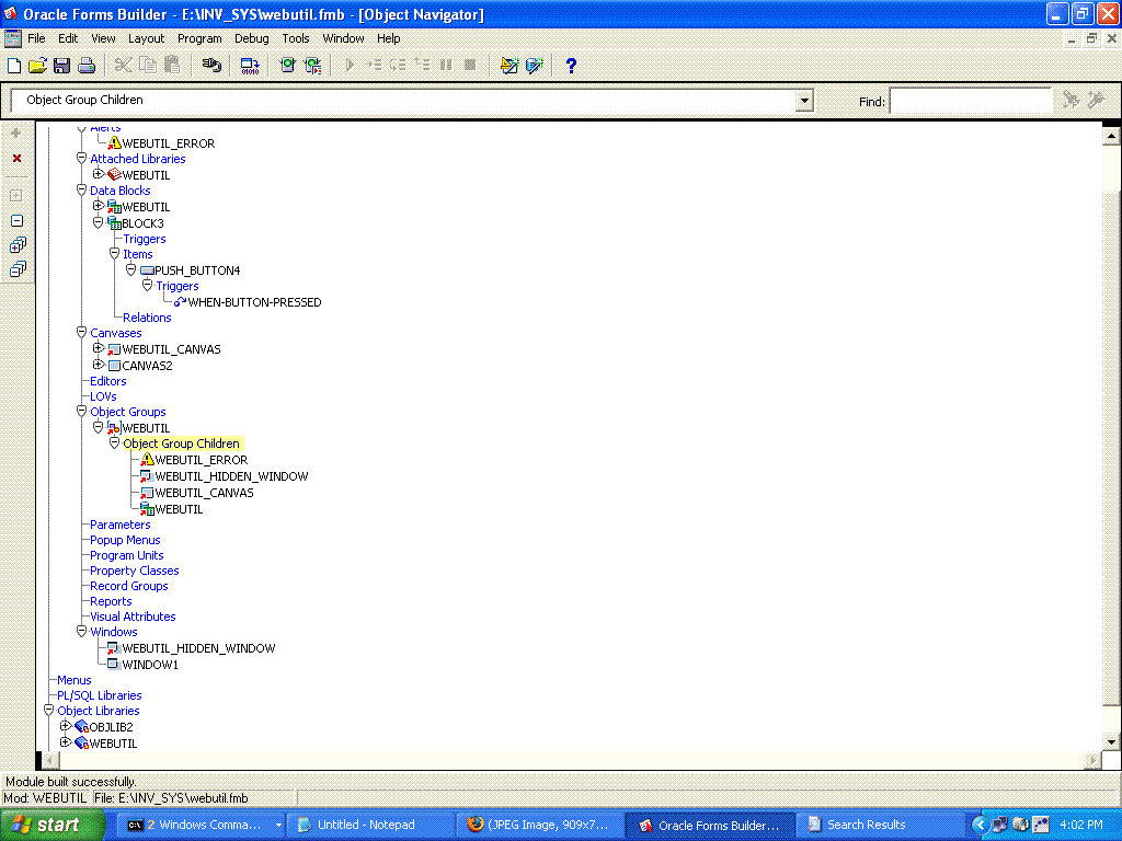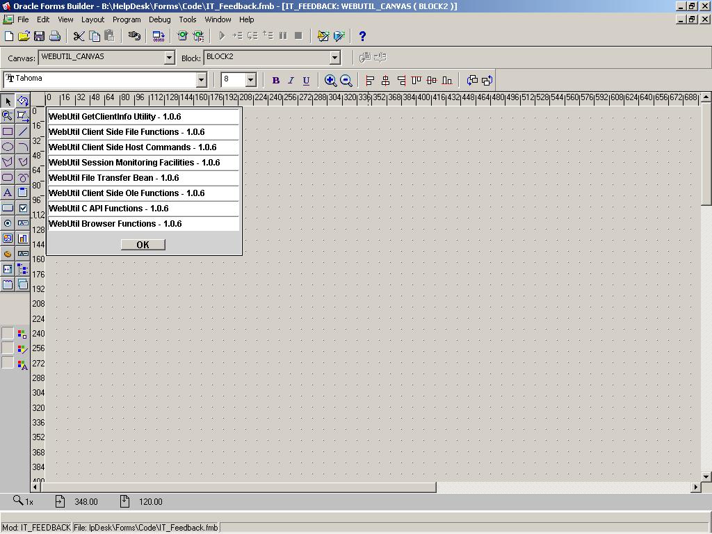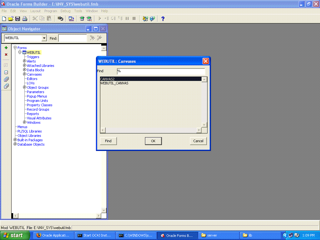 I added the path to the classpath. I opened the layout editor(layout_editor.gif) and it asked me for webutil_canvas or the normal canvas (with the button). The webutil canvas is just like the one that you have sent but when I run the form the contents dont appear in the form. While running the layout editor it does not give any errors. The webutil part is blank, when I run the form and the second form gives the error just like the way it did before