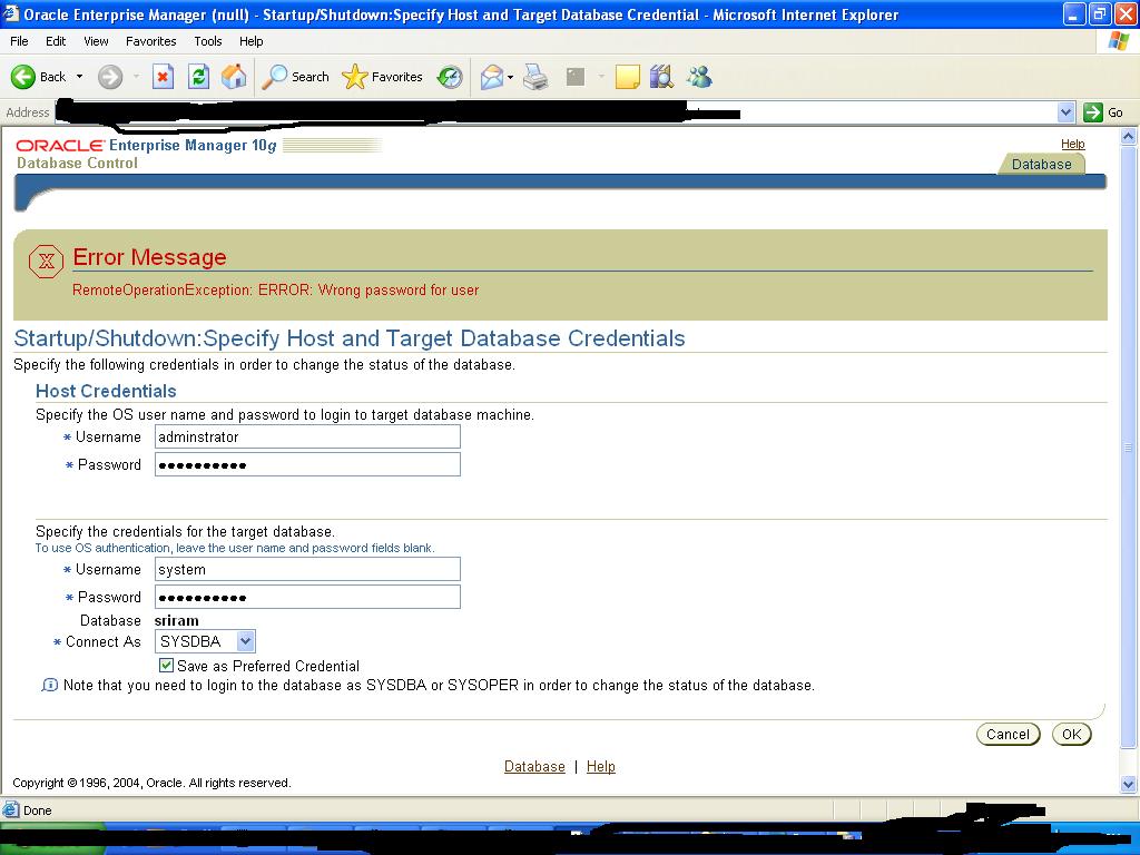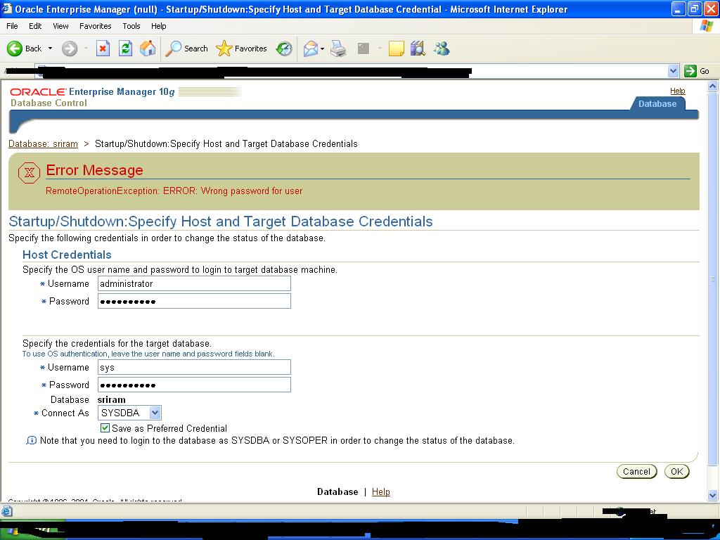 Home » RDBMS Server » Enterprise Manager » RemoteOperationException: ERROR: Wrong password for user (merged)