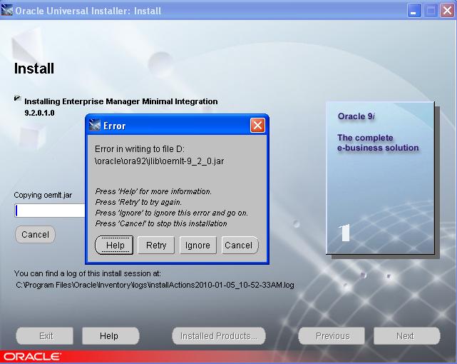 Error in writing to file D:\oracle\ora92\jlib\oemlt-9_2_0.jar