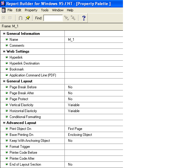 The property for all fields from M_DATE and M_BODY1 is set to "First Page and Enclosing Object"