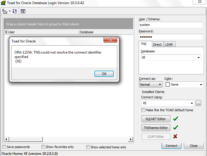 I am able to connect to Oracle from Oracle XE homepage and XE SQL command line but when I try to connect to Oracle from toad 10.5 I am getting the error 'TNS: could not resolve the connect identifier specified (XE)' .