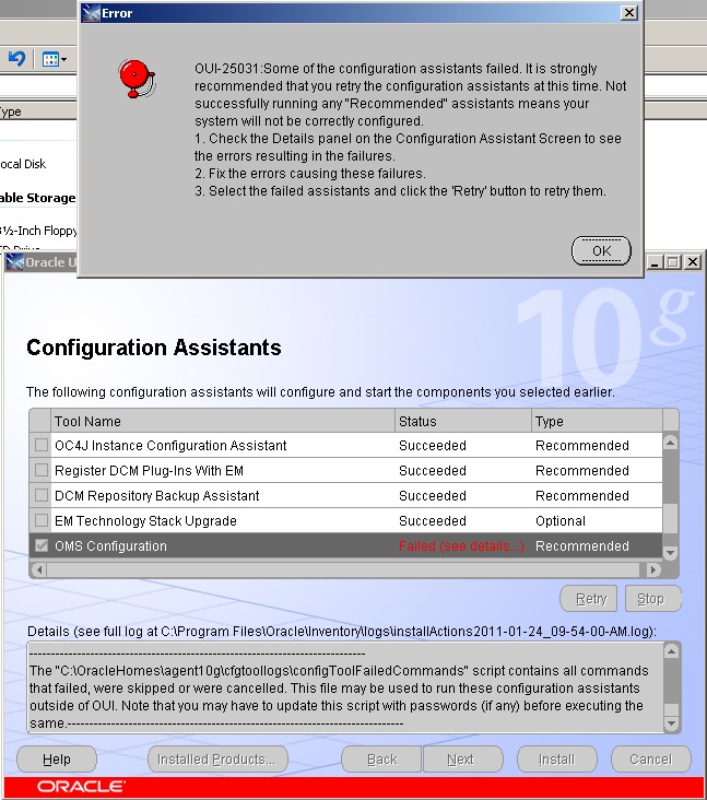 SEVERE: OUI-25031:Some of the configuration assistants failed. It is strongly recommended that you retry the configuration assistants at this time. Not successfully running any "Recommended" assistants means your system will not be correctly configured.