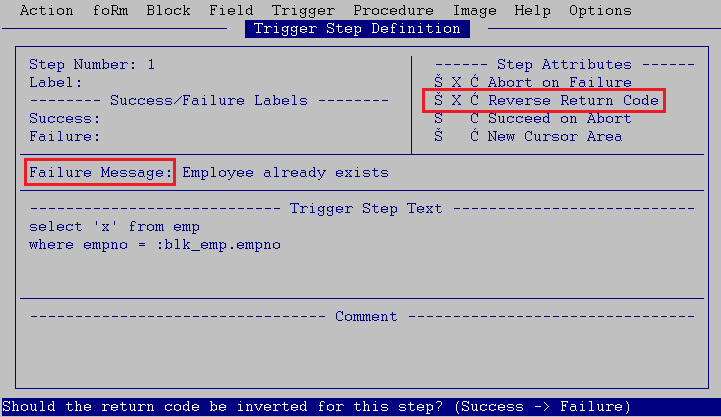 If such an employee already exists in a table, SELECT would return 'x'. It is a success. However, if "Reverse" is checked, trigger will return failure; you can even specify the "Failure message": "Employee already exists".