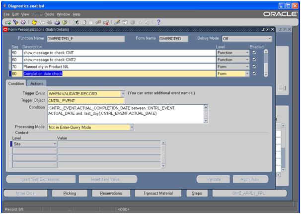 I've to incorporate a rule while 'releasing' (from WIP status) and 'closing' a batch that the actual completion date will be in the same month as that of actual start date, i.e. if actual start date is '14-APR-2011' then actual completion date has to be within '30-APR-2011'. I've been trying this with Form Personalization wher i'm writing :
