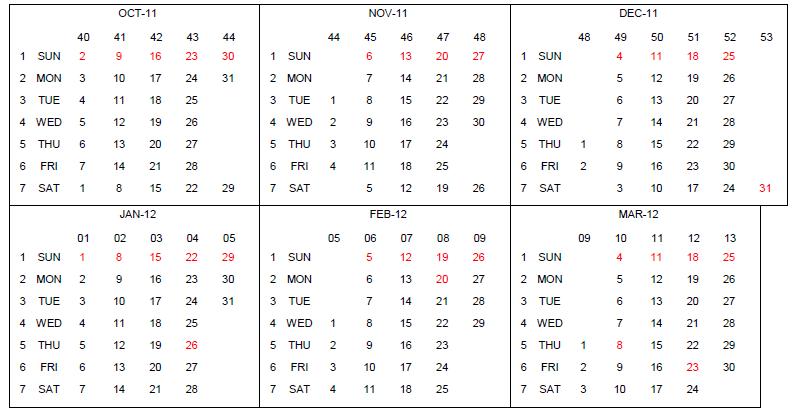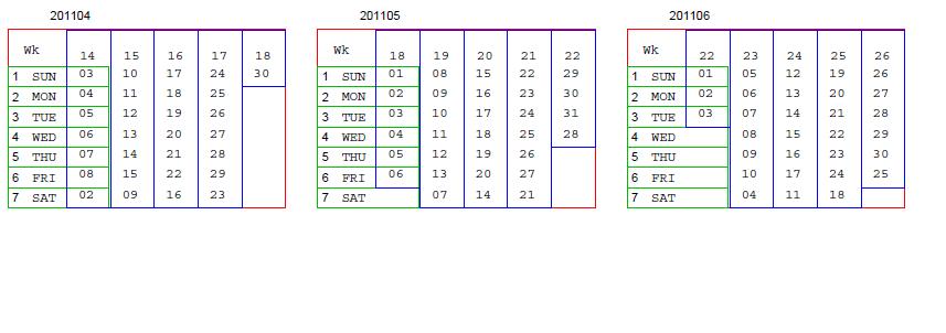Matrix with group report: 'month year' as matrix group field, 'day names' as rows, 'weeks' as columns and 'day numbers' as cell fields.