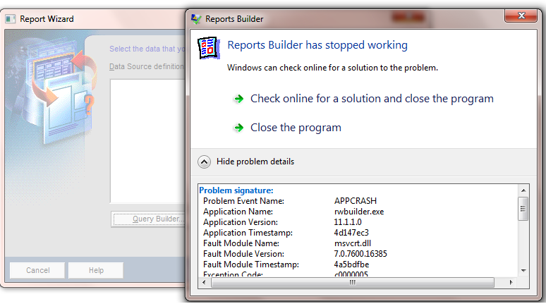 Home » Developer & Programmer » Reports & Discoverer » Report Builder has stopped working. (Oracle Forms & Reports 11g on Windows 7 64-bit.)