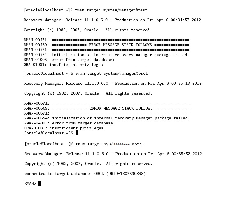 [oracle@localhost ~]$ rman target sys/********@orcl