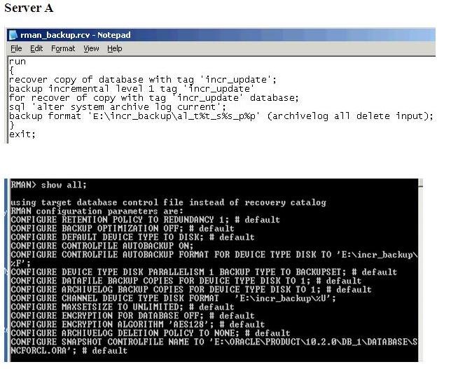 I am trying to learn about RMAN Incrementally Updated Backups. I created a database on Server A with the parameters and configurations as shown in image attached. I would like to restore full database on Server B (Test DB).The Server B is exactly same in directory structure as the Server A e.g ('E:\archive\','E:\incr_backup\'). I would like to automate this process so that it updates the Server B on daily basis for R&D purpose. Please guide me. or can i use database clone to update the backup from Server A to Server B?
