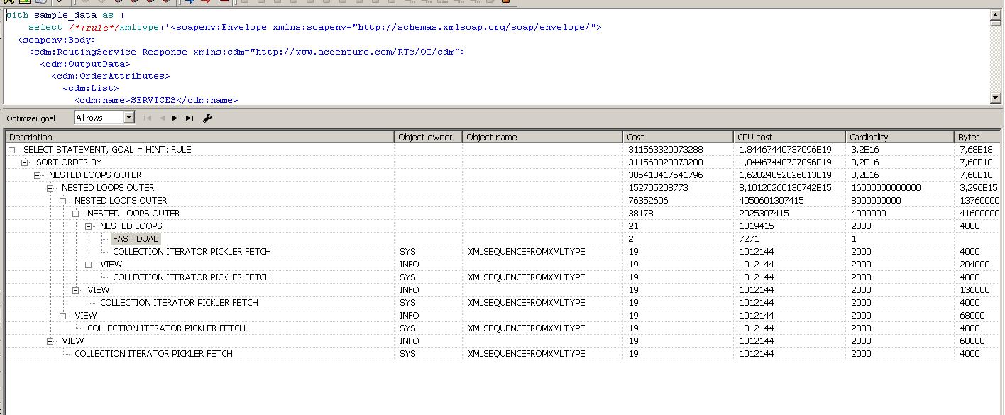 I have a sql statement which parses an XML and shows the result in tabular format. The problem is that the cost is enormous, and I don't understand why. The execution time is 1-2-3 seconds. In the explain plan, I can see FAST DUAL and some NESTED LOOPS, and COLLECTION ITERATOR PICKLER FETCH. Can this cost be a performance problem, or does CBO not estimate the cost correctly?