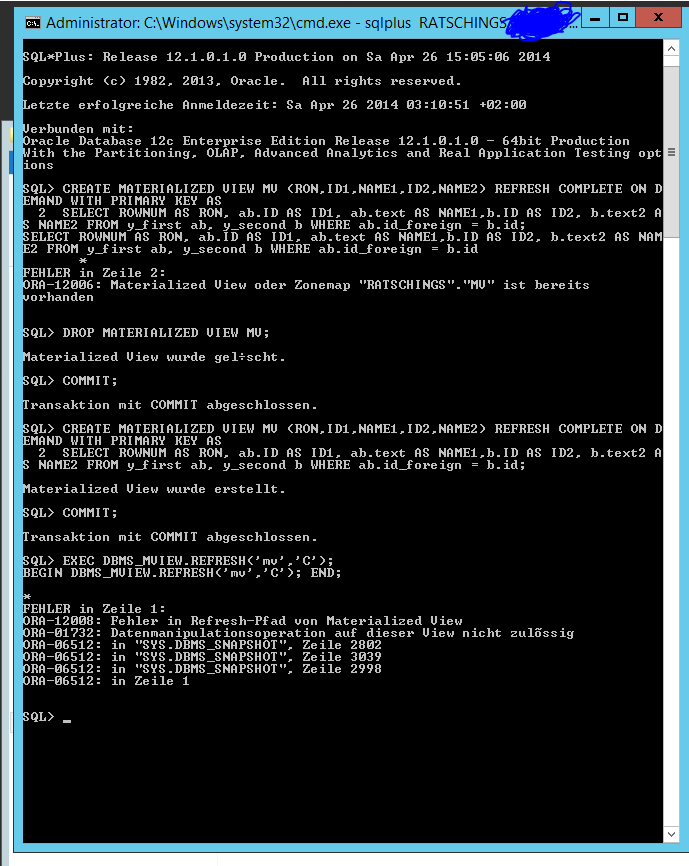 Home » SQL & PL/SQL » SQL & PL/SQL » Cannot refresh Materialized View with Join in Oracle 12c 12.1.0.1.0 after Create (Oracle Database 12c Enterprise Edition Release 12.1.0.1.0 - 64bit Production, Windows Server 2012)
