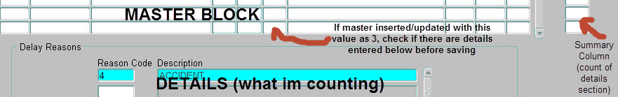 I have a form that has a master block that lets you enter multiple records. When one of these master records has a "code" field populated with a specific value, the details block needs to have at least one row entered in it as well (you can enter more than one detail row... if not for that, this would be easy to do).