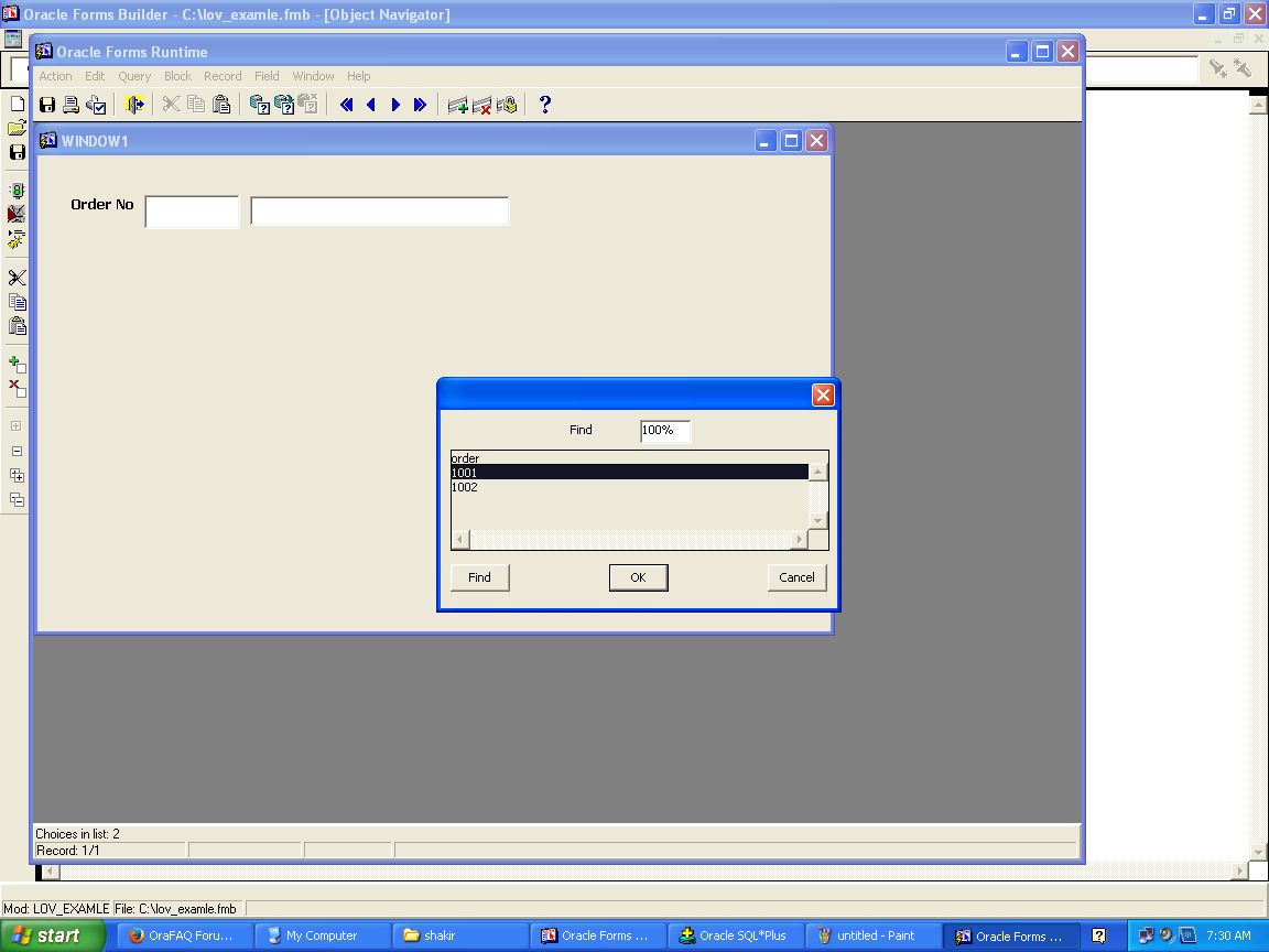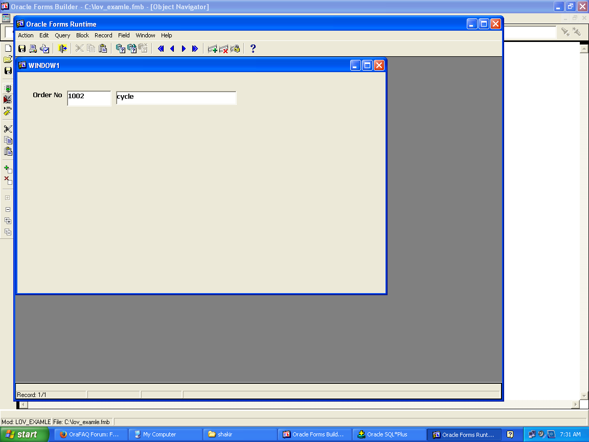 I am taking 2 columns order_no,order_name and set the return item for both individually, but when i close to the Main Window of the canvas , Showing the LOV of order_name and at the Tool Bar i am getting error frm 40212 invalid value for field order_name