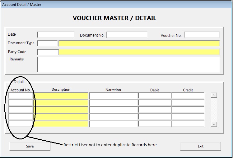 I would like to restrict the user at Form Level that if the account no is already entered in detail then multiple entries in the same may not be allowed.