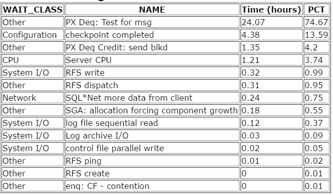 SELECT wait_class, NAME, ROUND (time_secs/3600, 2) "Time (hours)",ROUND (time_secs * 100 / SUM (time_secs) OVER (), 2) pct FROM (SELECT n.wait_class, e.event NAME, e.time_waited / 100 time_secs FROM v$system_event e, v$event_name n WHERE n.NAME = e.event AND n.wait_class <> 'Idle' AND time_waited > 0 UNION SELECT 'CPU', 'Server CPU', SUM (VALUE / 1000000) time_secs FROM v$sys_time_model WHERE stat_name IN ('background cpu time', 'DB CPU')) ORDER BY time_secs DESC;