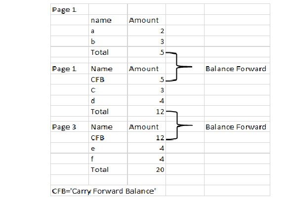 here main problem is i have to forward total into next page the next page total amount will be first page total=5+next page content(3+4)=12.
