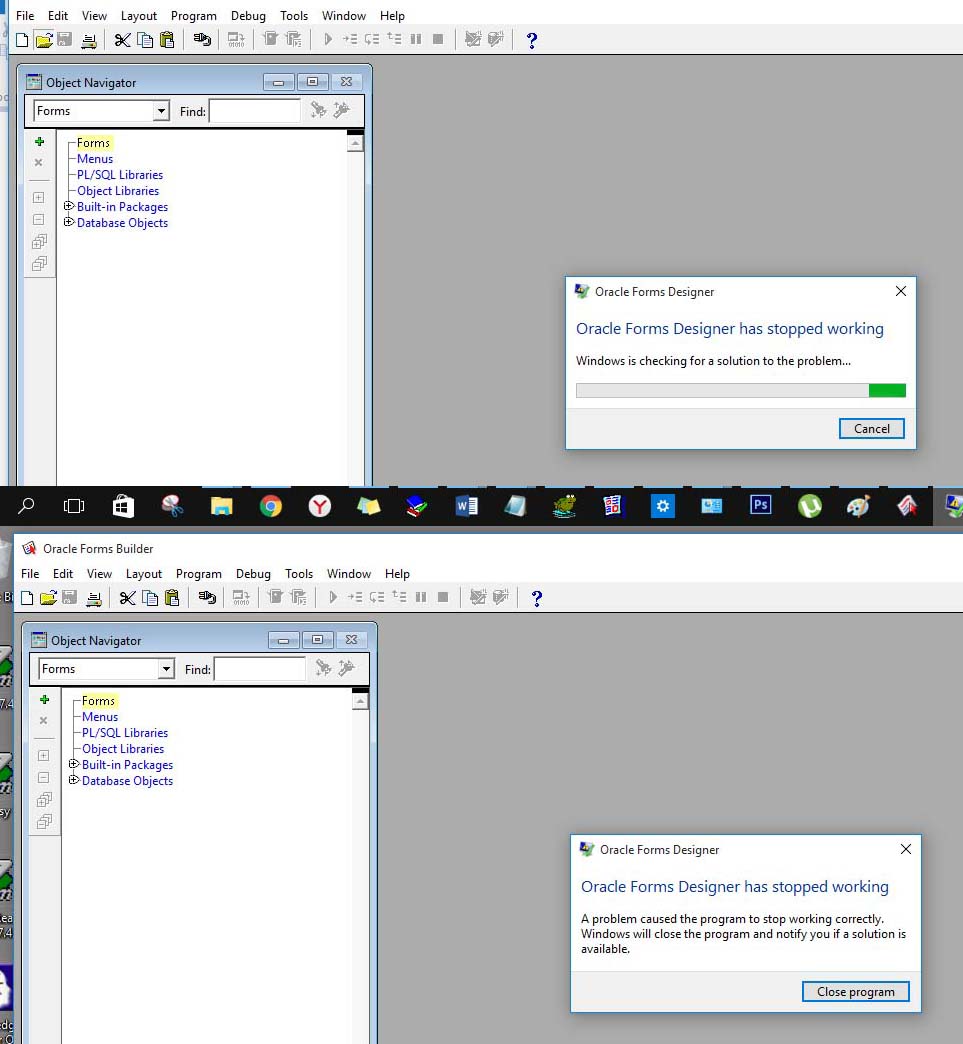 Thank you CraigB. I use Forms 10g, some of forms were compiled with winXp and others with win7. Many of them can be opened in win10 without problem, but some ot them cause a crach of Form builder.