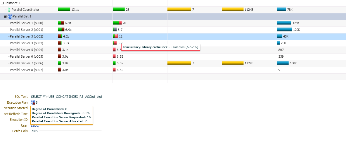 A case that can be noted is that parallel degree is downgraded from 16 to 8 with a hint about library cache lock.(As can be seen in the attached image file), however it did not happen for the original query.