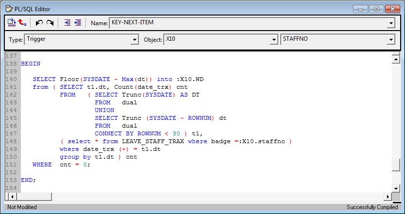 For your info, I'm currently working on a script to count consecutive working days. The script works fine on TOAD but somehow it triggered Encountered the symbol "SELECT" error every time when I tried to compile it in Form Builder 11g.