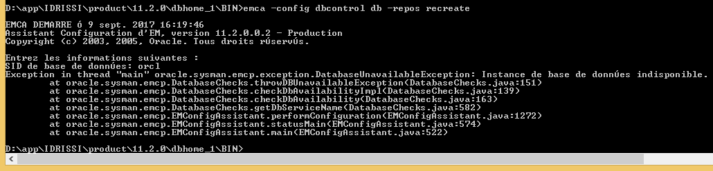 Logs are generated in directory D:\app\IDRISSI\product\11.2.0\dbhome_1/localhost_orcl/sysman/log