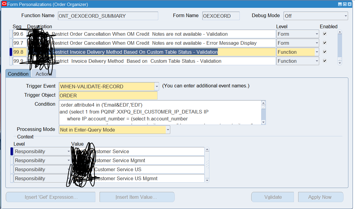 I have setup 2 new form personalization rules and at context level setup 4 responsibilities for which it should work but it is not restricting and works for all responsibilities which has access to that form.