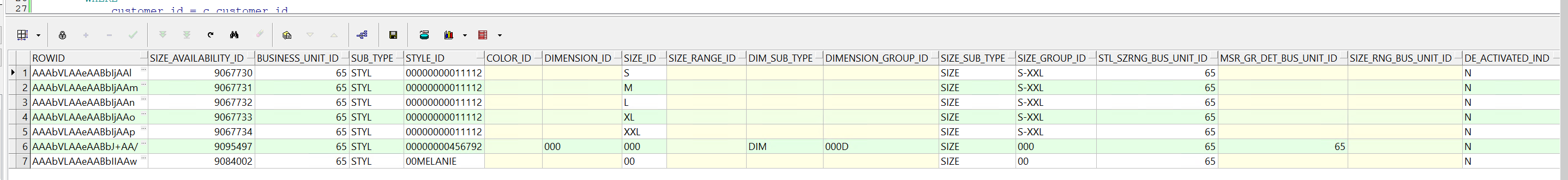 For example from the screen shot only STYLE_ID =00000000456792 and 00MELANIE should be retrieved and not others. The following is the query that I have used (which is retrieving 00000000011112 and that should not be the case because it has 4 different sizes).