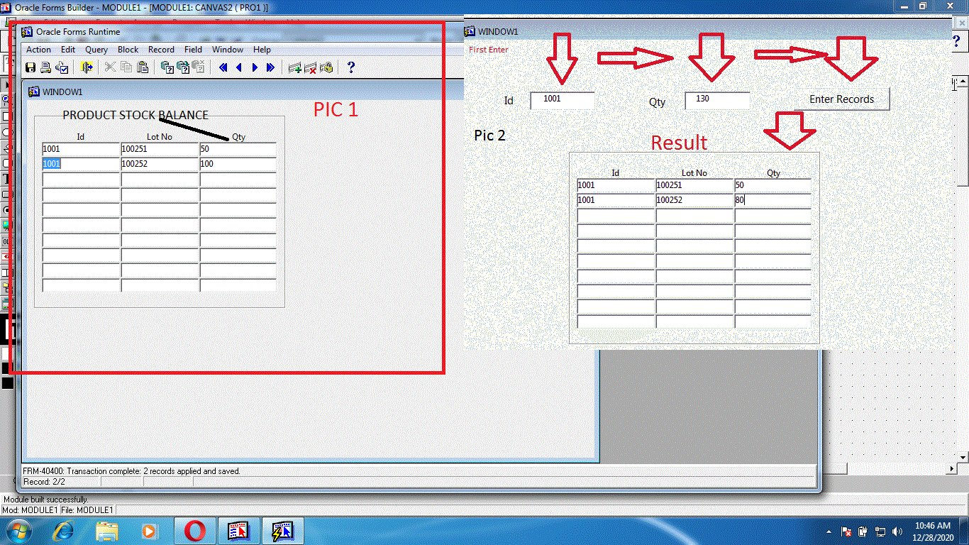 now i have make a forms in oracle which has two column Id and qty , and also make push button for trigger which select id and qty from forms (id 1001 and qty 130)