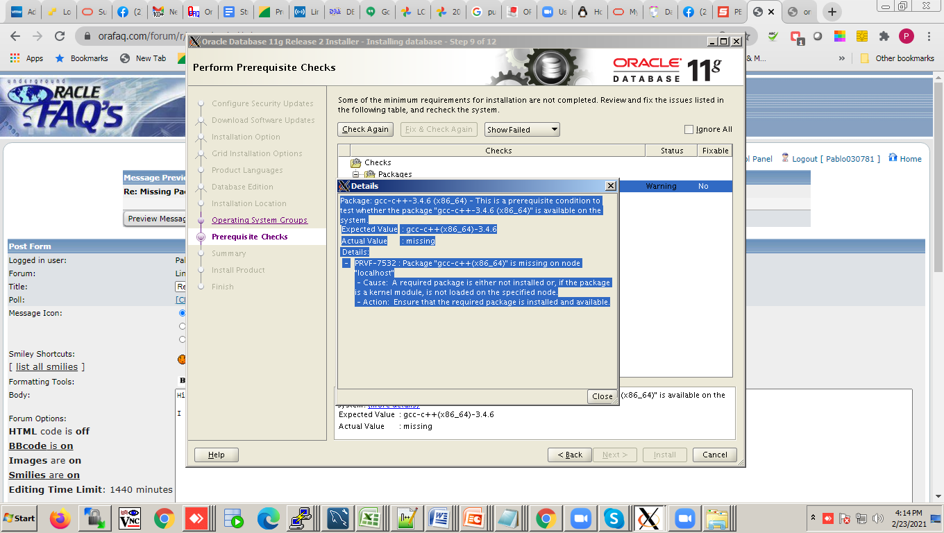 PRVF-7532 : Package "gcc-c++(x86_64)" is missing on node "localhost" - Cause: A required package is either not installed or, if the package is a kernel module, is not loaded on the specified node. - Action: Ensure that the required package is installed and available.