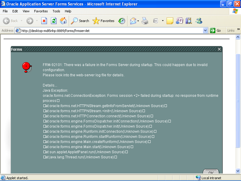 oracle.forms.net.ConnectionException: Forms session <2> failed during startup: no response from runtime process