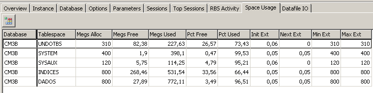 The attached image/gif shows tablespaces scenery of my test database CM3B. This image comes from toad screen.