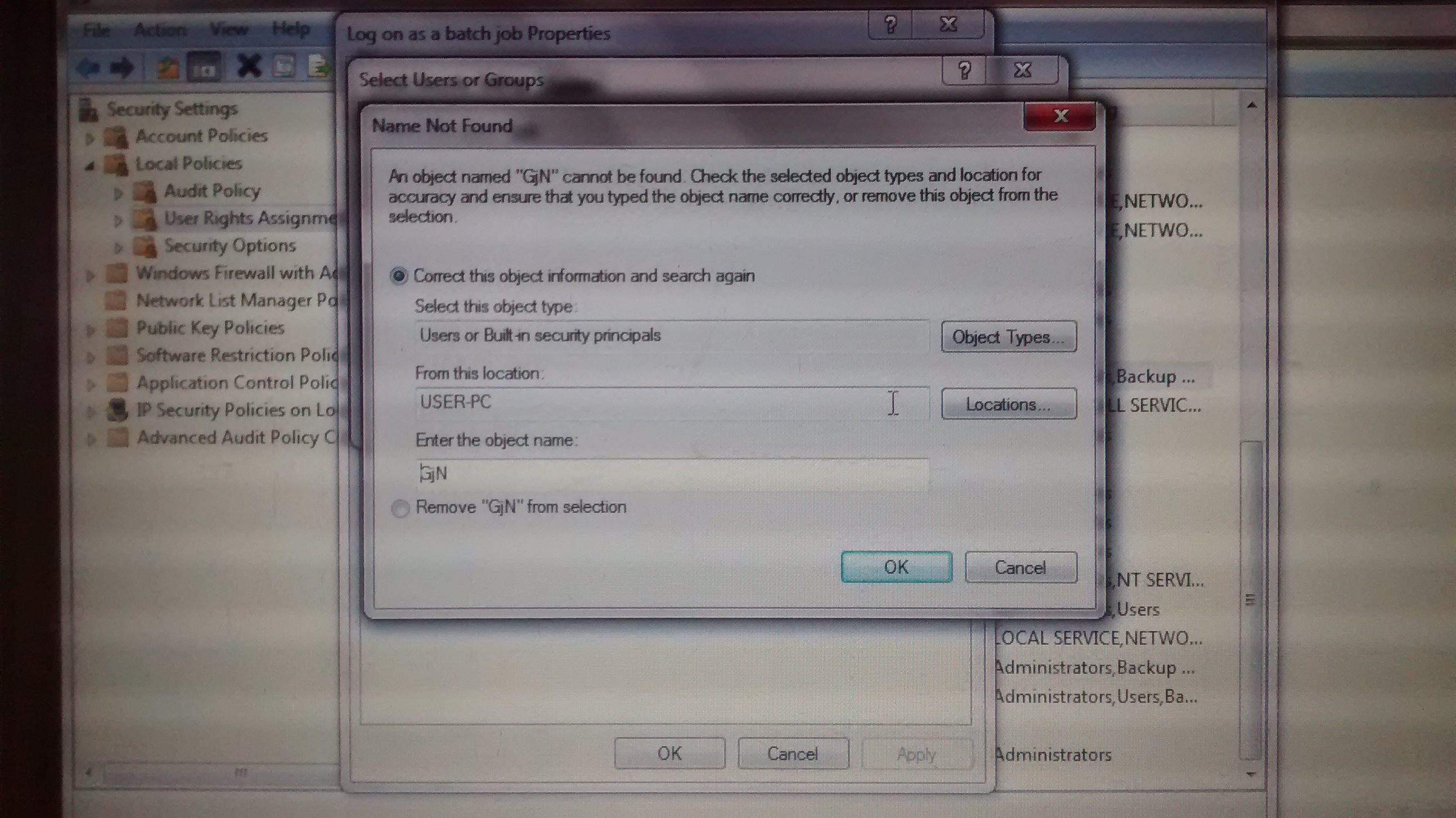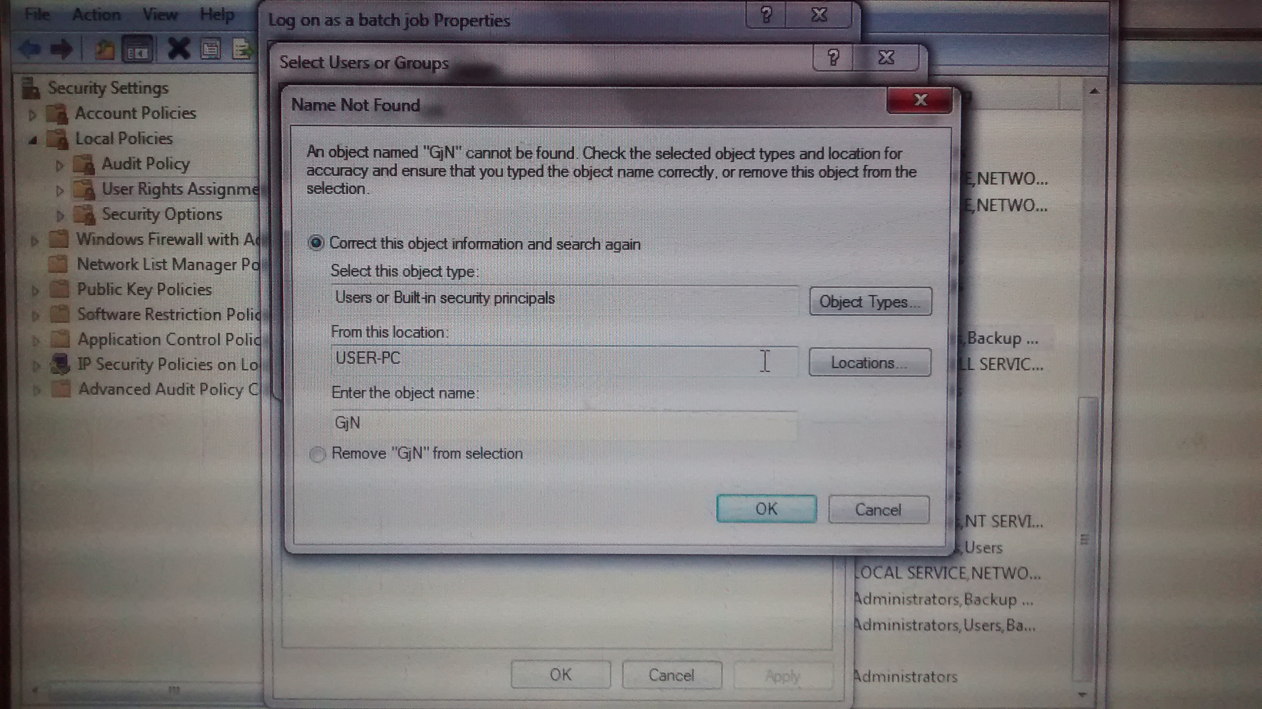 You may notice, when adding your account to the privilige "logon as a batch job", that your local host name is added by default as domain, rather than just the local user name.