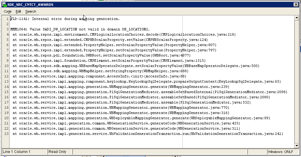 I've been having some difficulty with OWB. I have several mappings that are producing the below error when I try to validate them. These mappings have validated and deployed successfully in the past but are not.